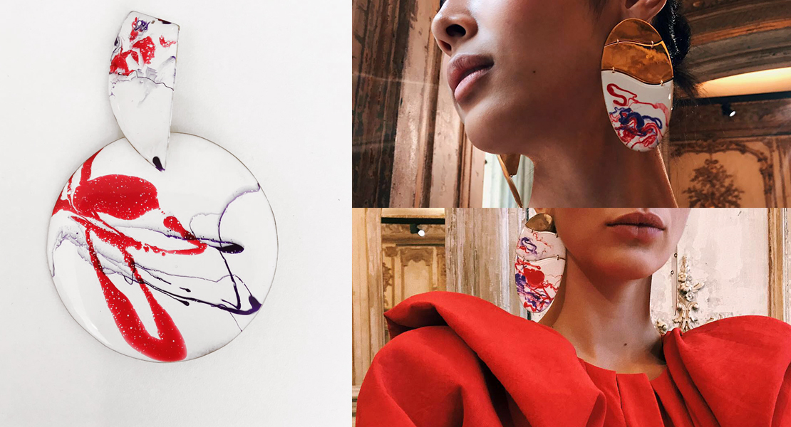 Las firma de moda Carmen March acompañó con estos pendientes su colección de 2017. El objetivo era crear pendientes grandes para pasarela, con una imagen artistica y fluida acordes a modelos con drapeados voluminosos y en movimiento. Realizados en resina pintada a mano y bañados en oro de 24K. Cada pendiente es único e irrepetible.