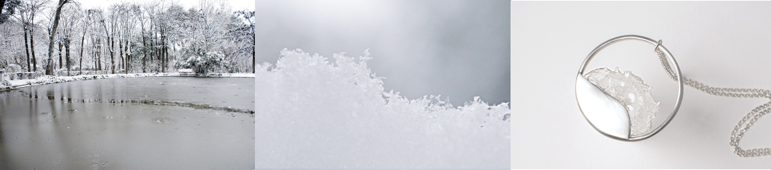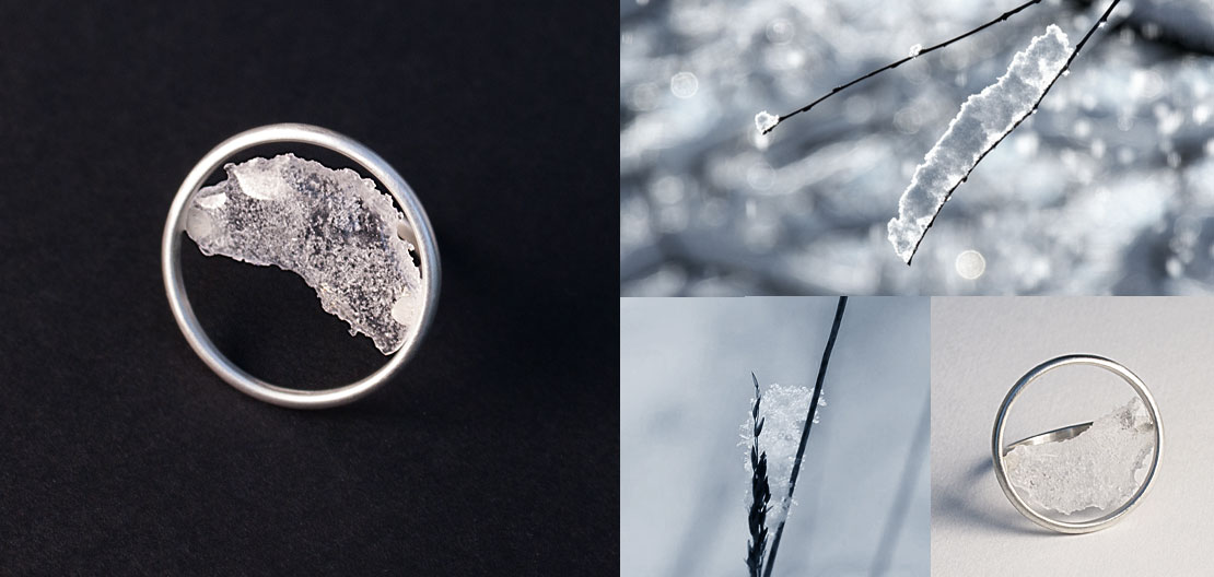 Las joyas ICE están inspiradas en algunas de las formaciones naturales del hielo. Aquellas que de producen al entrar en contacto con otros elementos de la naturaleza, formaciones únicas y fascinantes como cristales, estrellas o burbujas congeladas. Son la representación de la ligereza y sutilidad del hielo suspendido en círculos de plata. La colección está realizada en plata de ley y vidrio altamente resistente.