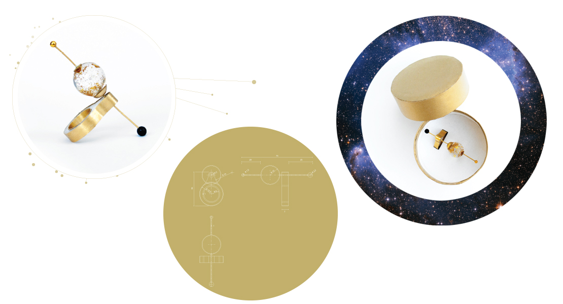 Joya homenaje a la astrónoma Henrietta Leavitt. Representa la visión de la pequeña nube de Magallanes, espacio de investigación de la astrónoma. El diseño del anillo se centra en la luz y la observación del espacio. Esta formado por una pequeña esfera de vidrio con partículas de oro suspendidas a modo de estrellas. Ésta a su vez se sujeta a la base por un eje móvil. La base está realizada en vidrio y metal bañado en oro de 24K.
