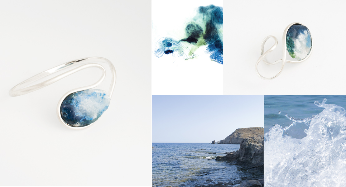 El deseo de contemplar el mar como parte de una joya se ha materializado en esta colección. Pequeñas ventanas de mar que se adaptan a las ondas de plata en un engaste parcial que emula la libertad del agua, en algún punto sostenida pero que se libera por sus extremos. Un lenguaje propio y artístico que busca la experimentación y creatividad.